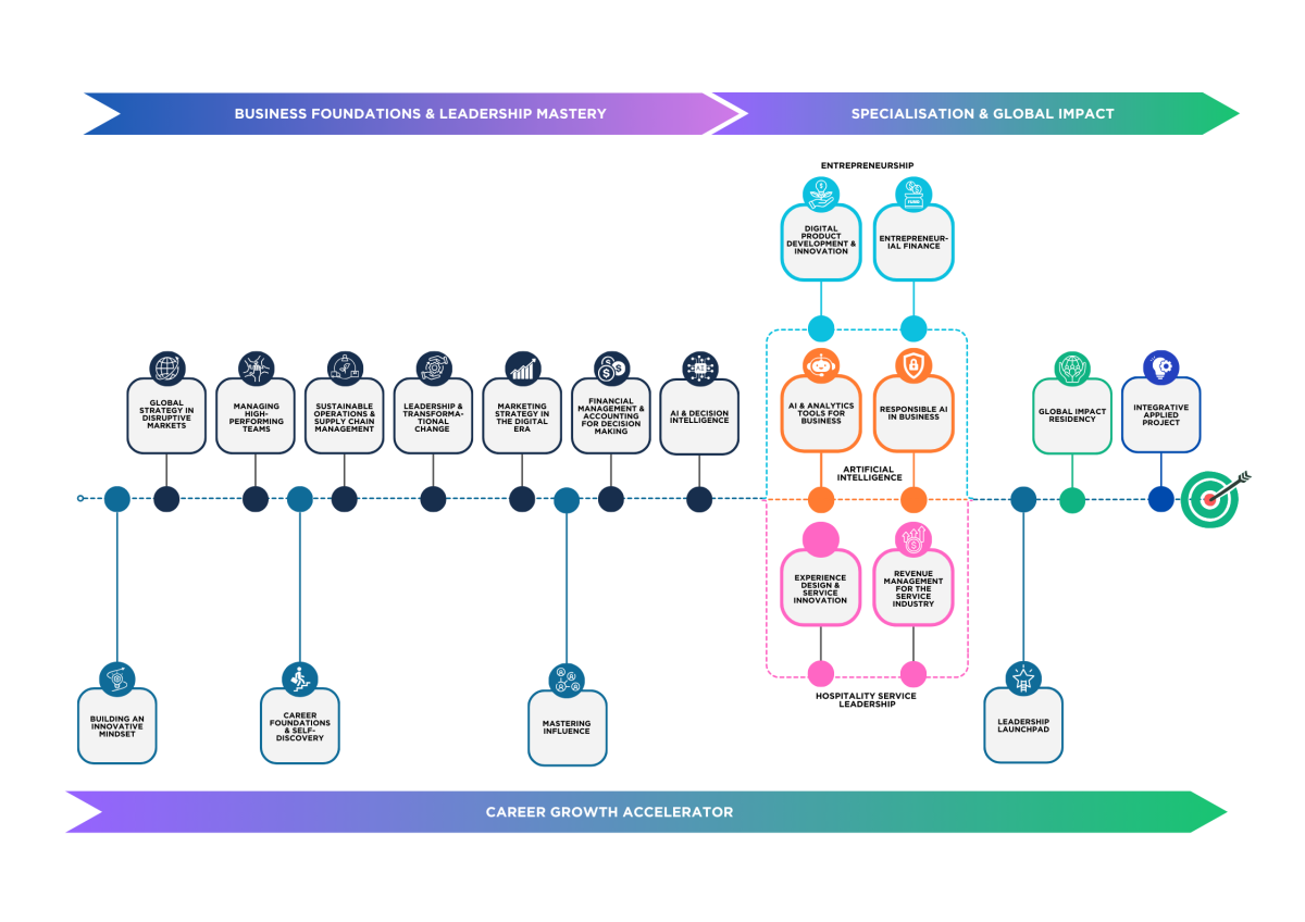 A bespoke and unique four-stage Career Growth Accelerator runs alongside the MBA, combining self-discovery with the mindset, soft skills, and strategic insight to lead and advance your career. Plus, the Global Impact Residency offers an international consultancy project with purpose-driven organisations, enabling you to apply your MBA learning to real-world challenges while creating positive social and environmental impact.