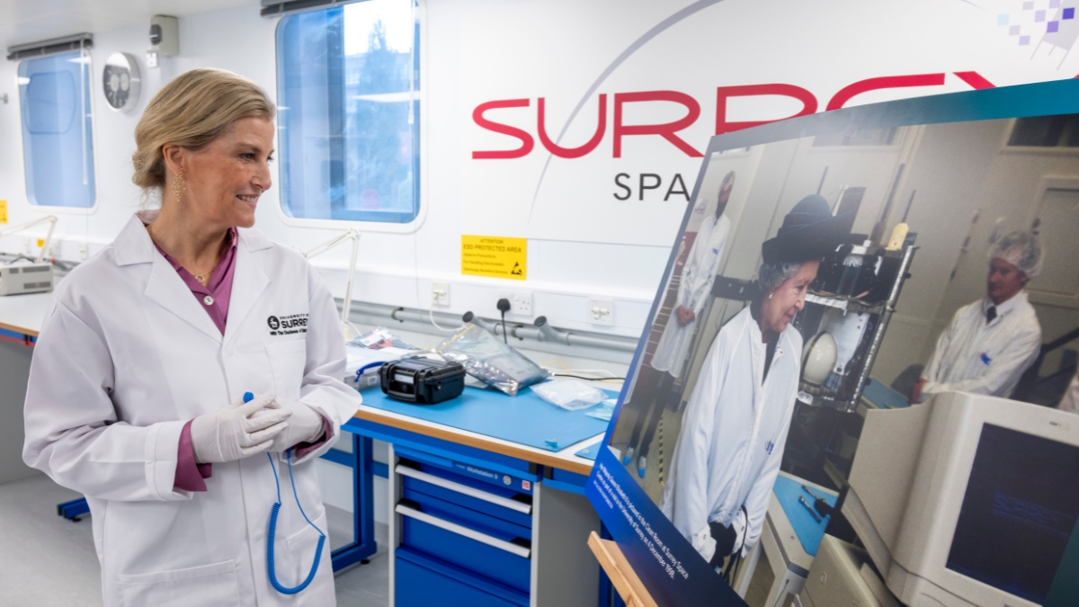 At the Space Centre, The Duchess visited the satellite clean room toured by Her Late Majesty Queen Elizabeth II in 1998. In the clean room, Her Royal Highness helped to fit a panel engraved with Their Royal Highnesses’ Royal Cyphers to Jovian-1, a satellite which Surrey students helped develop.