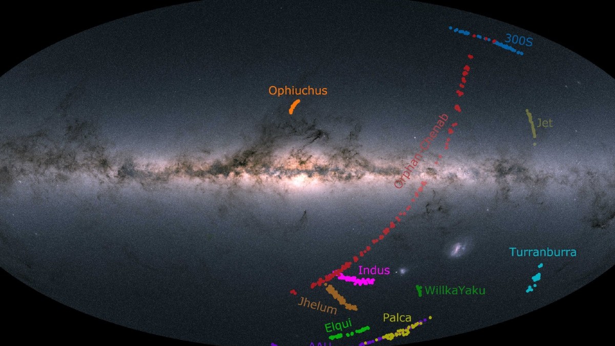 Location of the stars in the dozen streams as seen across the sky. The background shows the stars in our Milky Way from the European Space Agency’s Gaia mission. The AAT is in a Southern Hemisphere telescope so only streams in the Southern sky are observed by S5.