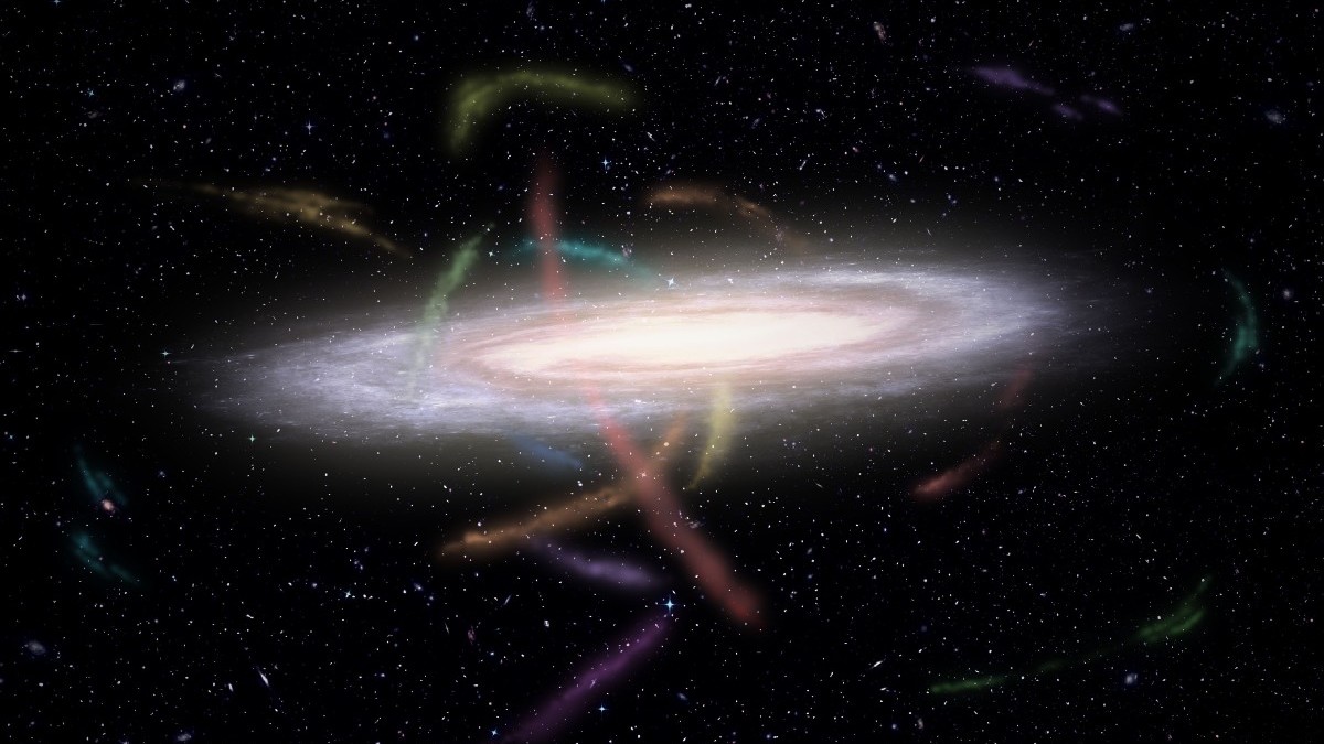 Artist representation of our Milky Way Galaxy surrounded by dozens of stellar streams. These streams were the companion satellite galaxies or globular clusters that are now being torn apart by our Galaxy’s gravity