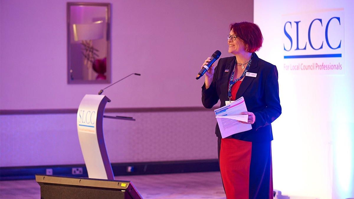 Jane during a speaking engagement at the Society of Local Council Clerks